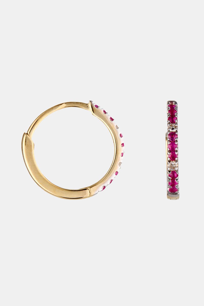 Créoles en or jaune serties de 2 diamants et 9 rubis.