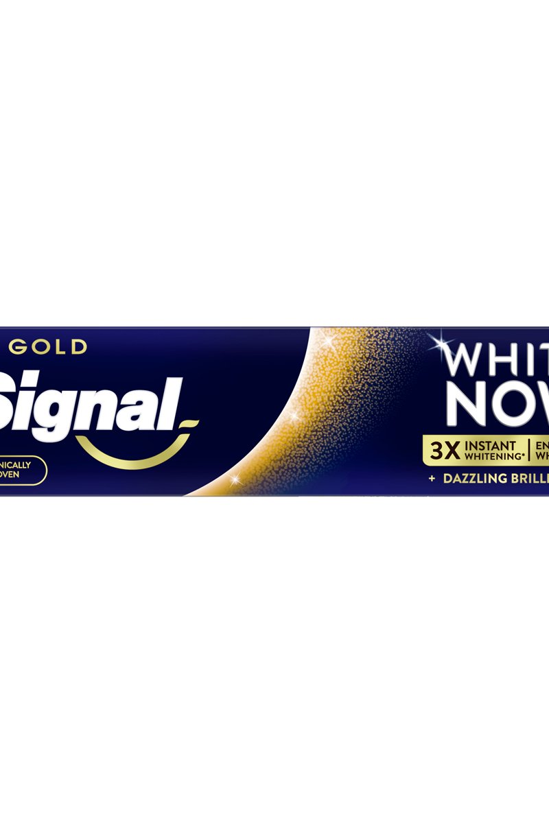 La formule du dentifrice Signal White Now Gold contient des pigments bleu-saphir et verts qui corrigent la couleur de vos dents pour un sourire 3 x plus blanc instantanément.