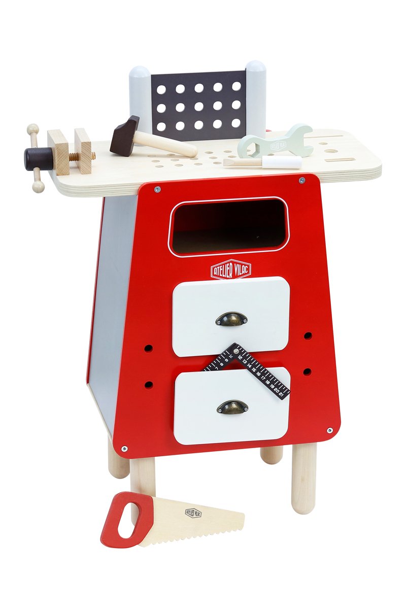 Contenu : établi, marteau, scie, tournevis, clé plate, clous, écrous, boulons et planchettes percées.