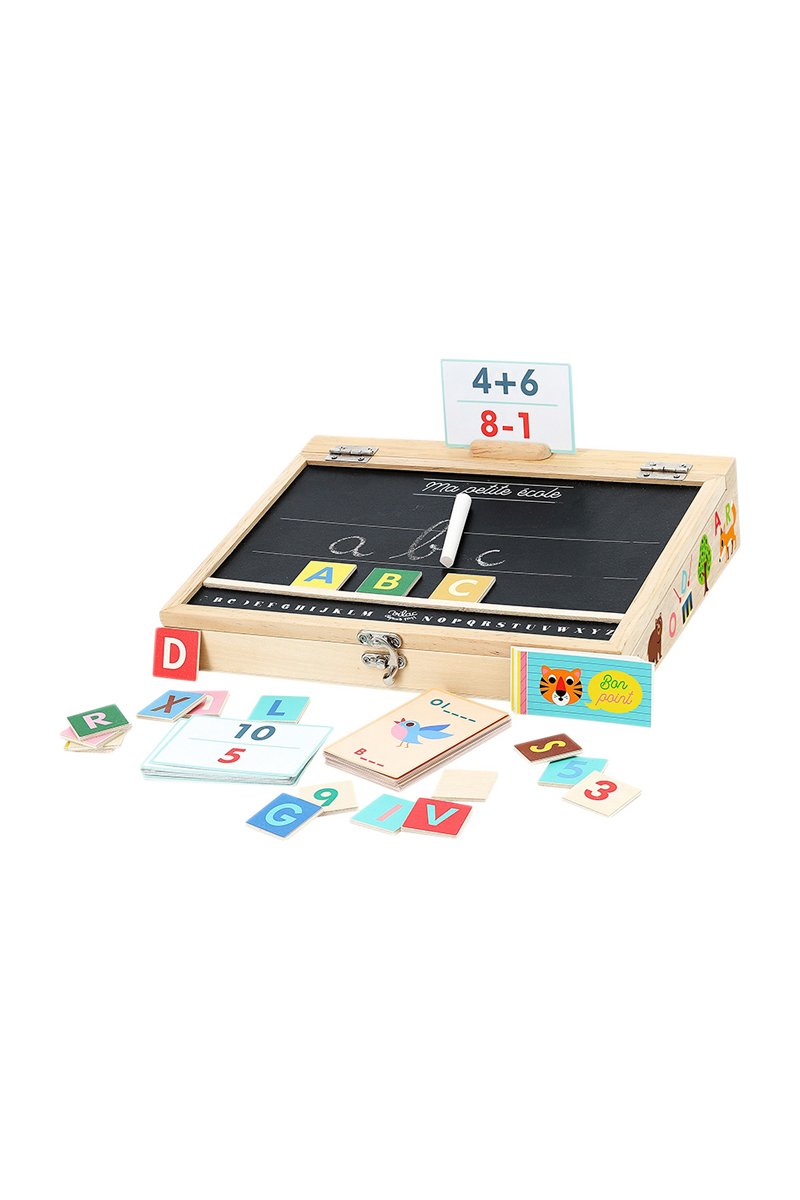 47 lettres et 23 chiffres en bois, 50 cartes modèles pour essayer de reconstituer des mots en français et en anglais et 30 cartes pour faire ses premières additions et soustractions.