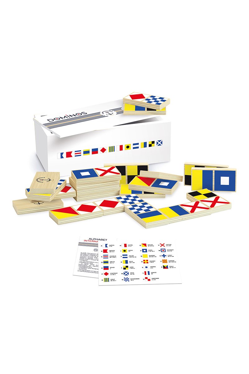 Avec son graphisme original, ce jeu de dominos en bois permettra également de découvrir la signification des pavillons (noms donnés aux drapeaux nautiques) qui servent à communiquer entre les navires.