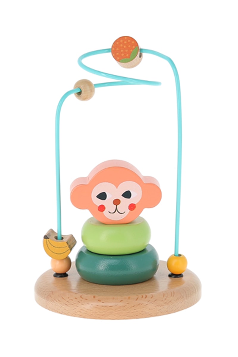 Ce jouet d'éveil en bois propose deux activités : un jouet à fil avec des bananes, des perles et des fraises, et une partie empilable avec 3 pièces en bois représentant un petit singe.