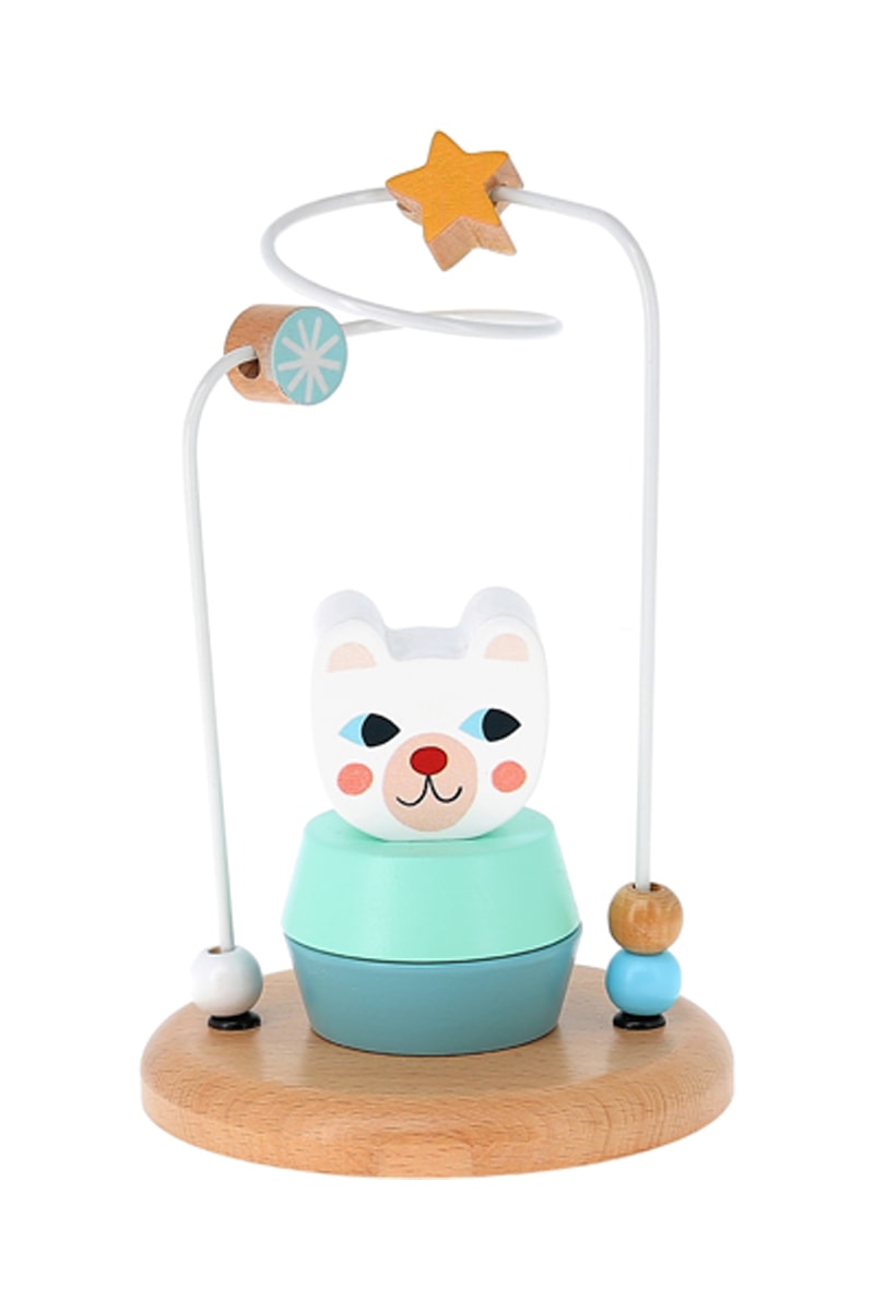 Ce jouet d'éveil en bois propose deux activités : un jouet à fil avec des étoiles, des perles et des flocons, et une partie empilable avec 3 pièces en bois représentant un ours blanc.