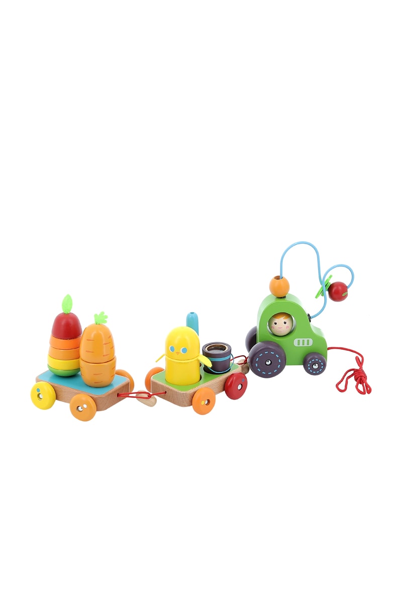 Ce jouet d’éveil en bois se présente sous la forme d’un tracteur à promener, accompagné de pièces de formes et de couleurs différentes à empiler et manipuler.