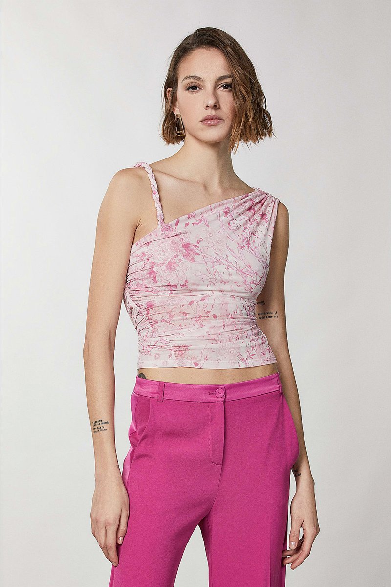 Large bretelle sur le côté gauche et fine bretelle effet tressé sur le côté droit.