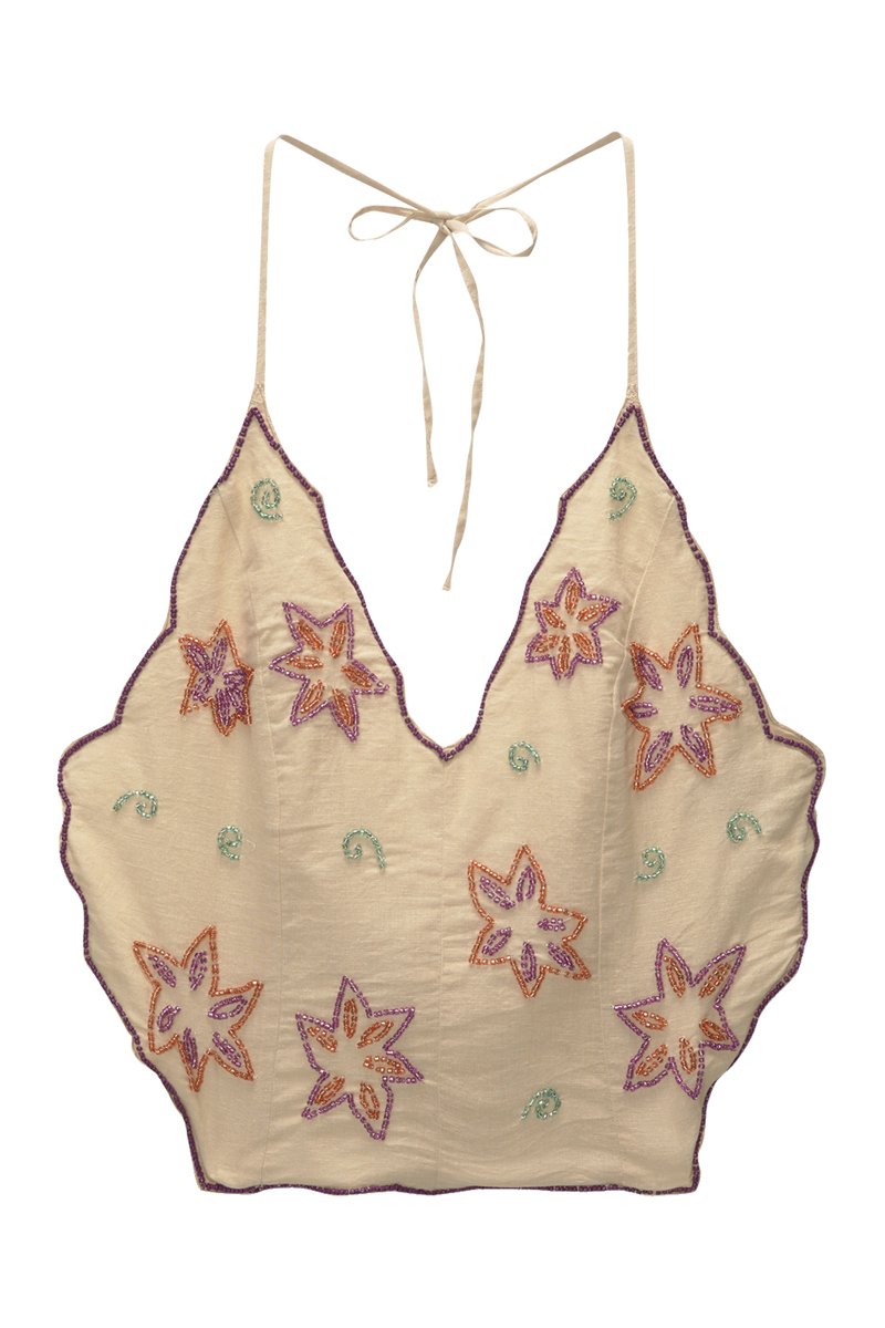 Motifs fleurs brodés.
