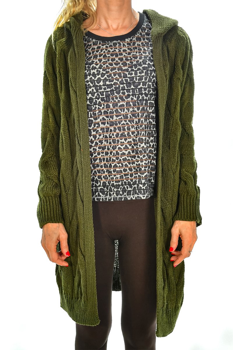 Maille ajourée et torsadée sur les manches, devant et au dos.