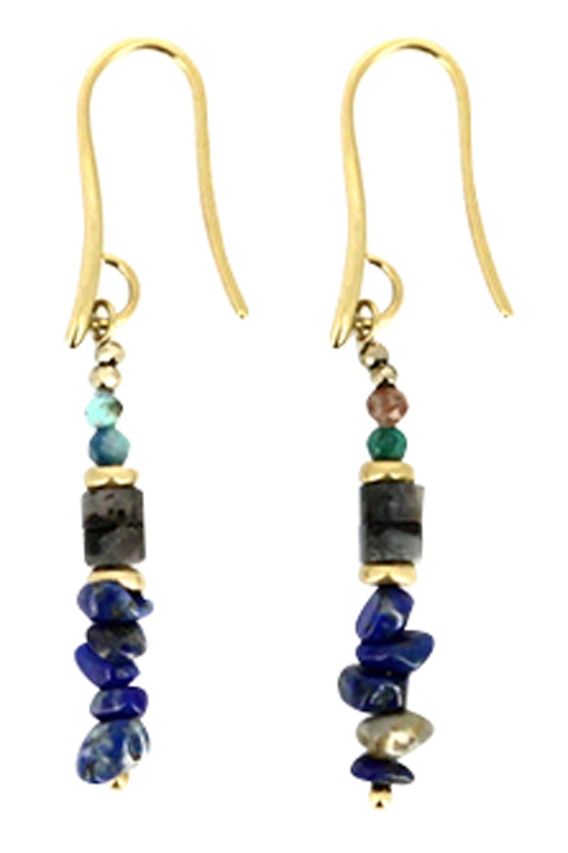 Boucles d'oreilles pendantes serties de lapis-lazuli et de pierres semi-précieuses.