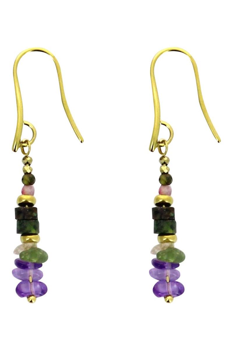 Boucles d'oreilles pendantes serties d'hématite et de pierres semi-précieuses.
