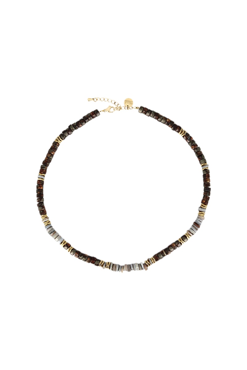 Collier serti de nacre Heishi, d’hématites et de bronzites.