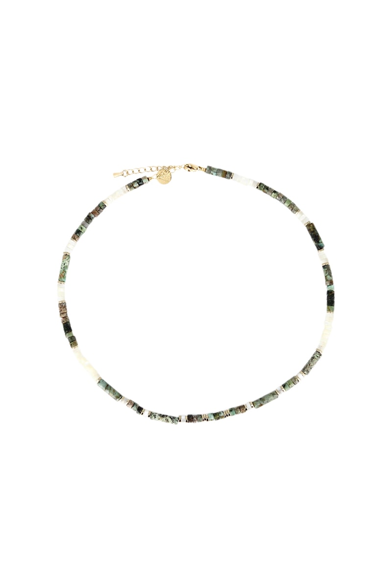 Matière : acier inoxydable, turquoises, nacres et hématites
