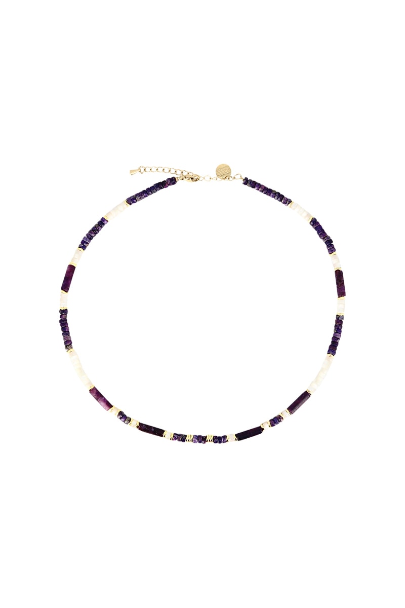 Collier serti de lépidolites, nacres, spinelles et hématites.