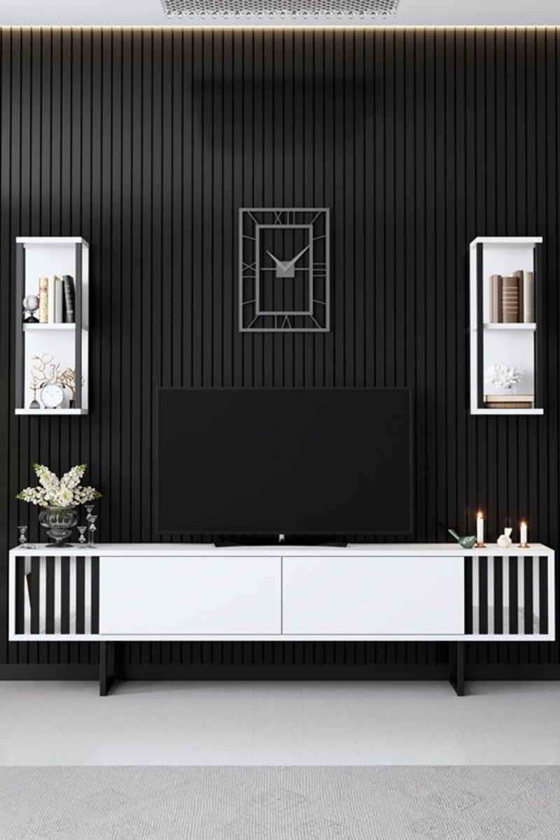 Meuble TV 2 abattants et 2 étagères murales - 180 x 48 x 30 / 2 étagères de 22 x 60 x 21 cm