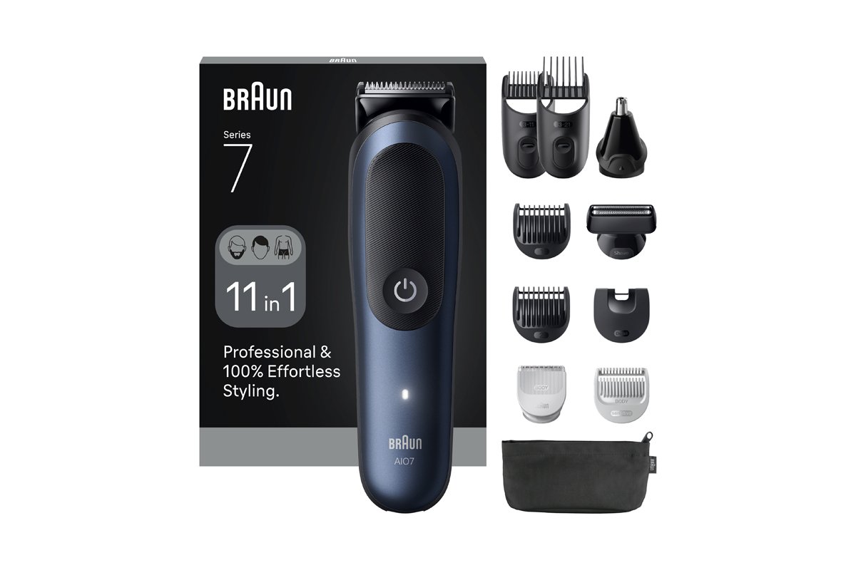 Créez votre style comme un professionnel et 100% sans effort : kit 11-en-1 de Braun pour un rasage de la tête aux pieds avec des outils prévus pour tailler votre barbe, vos poils d’oreilles et de nez, couper vos cheveux et raser votre corps.