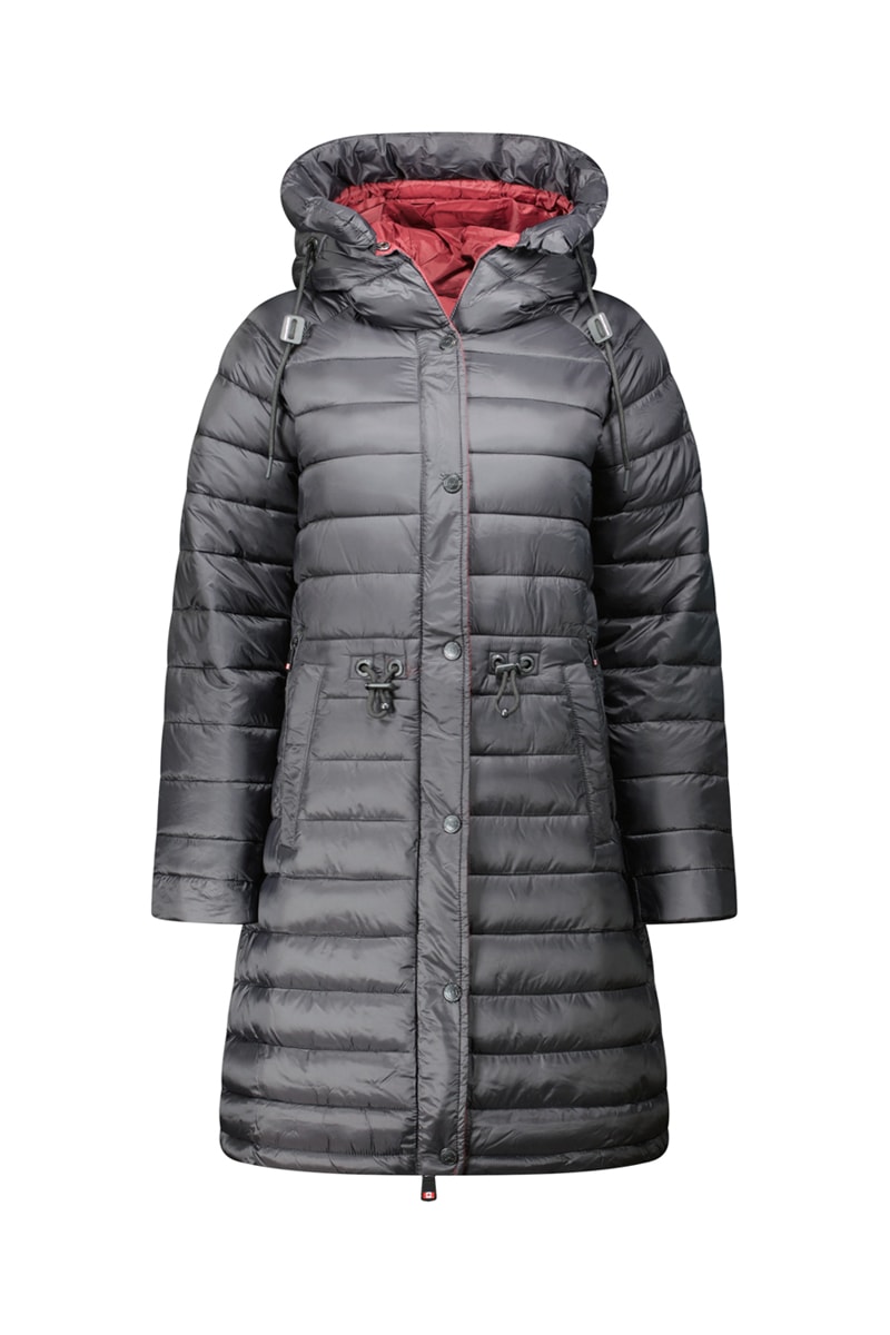 Doudoune à capuche avec liens de serrage.