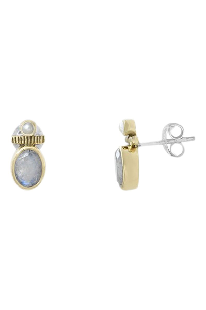 Puces en argent serties d’une pierre de lune et d’une perle d’imitation.