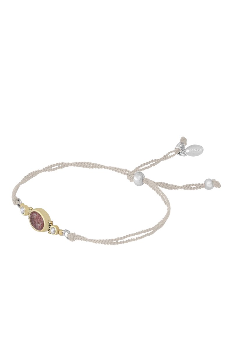 Laiton serti d'un strawberry quartz et de 2 perles synthétiques.
