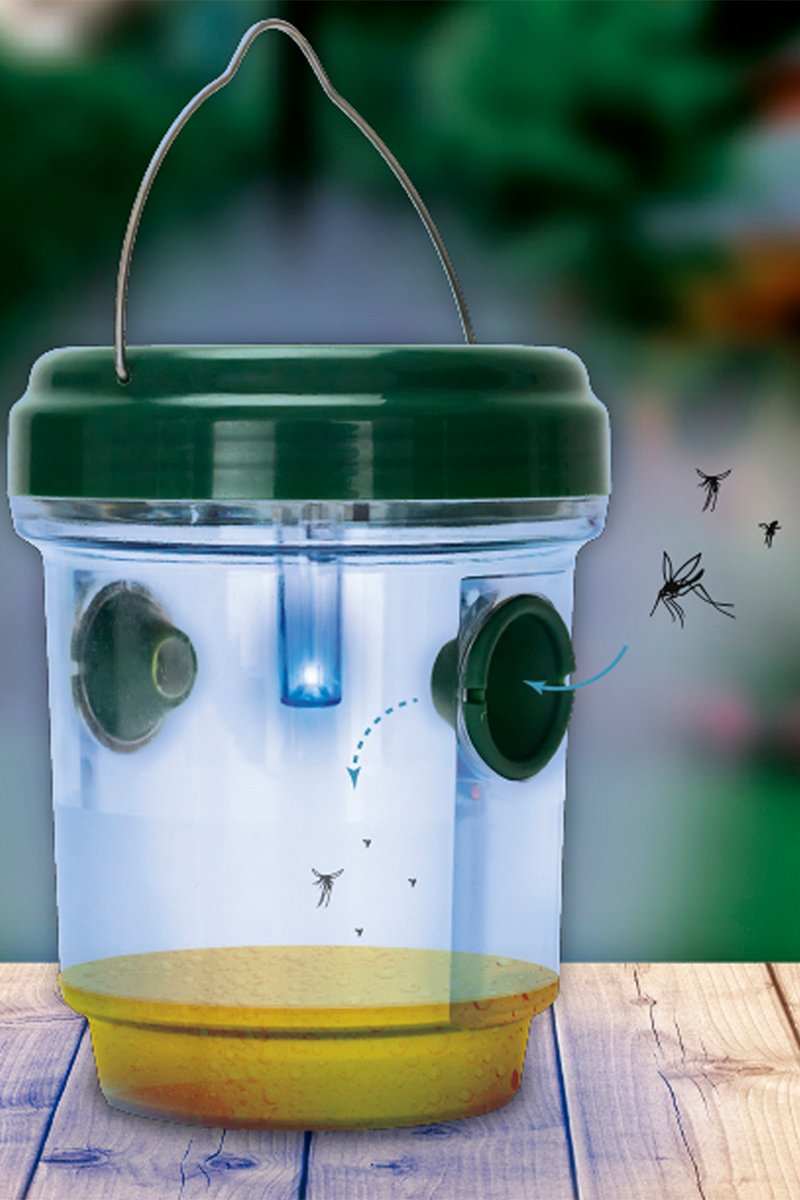 Les insectes sont attirés par la lumière bleue et se retrouvent pris au piège dans le récipient.