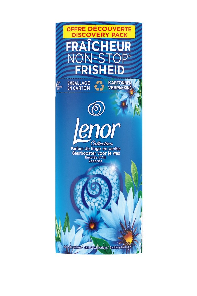 Le parfum de linge en perles Lenor est présenté dans un carton résistant à l’humidité.