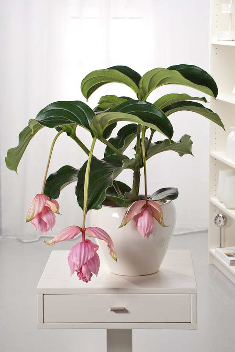 Entretien : placer la plante dans un endroit où l'air est humide. La Medinilla préfère également une température élevée. Elle ne supporte pas très bien le froid. Il est recommandé, dès que la fleur s'arrête de fleurir, d'enlever ses vieilles fleurs. Ensuite, la Médinilla peut faire pousser de nouvelles feuilles et peut-être aussi des fleurs !
