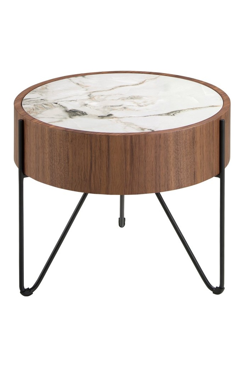 Table d’angle en porcelaine effet marbre et bois.