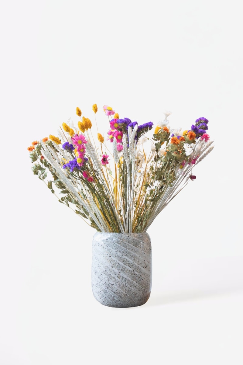 Nom latin : Tarwe, Acroclinium, Phalaris, Bidens, Statice sinuata et Rhodanthe