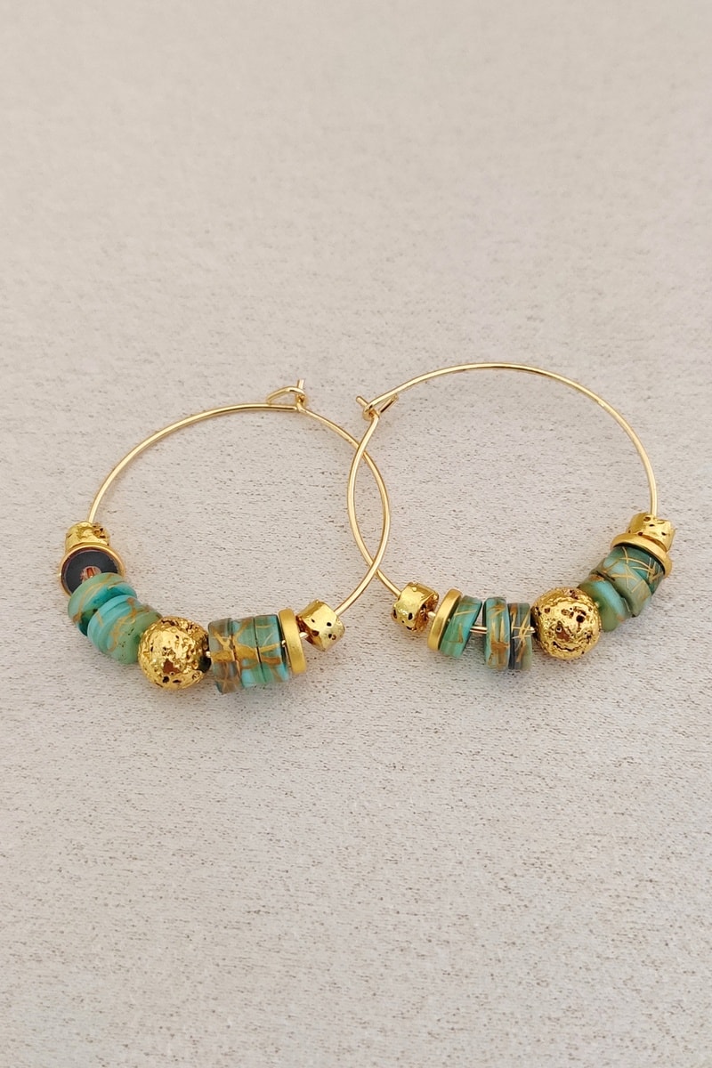 Créoles serties de 6 variscites et de 5 perles d’imitation.