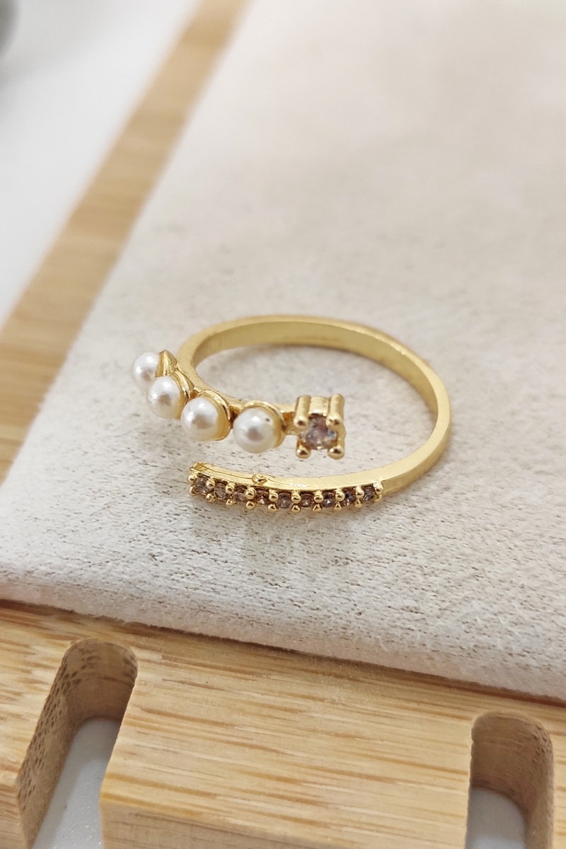 Bague réglable sertie de 4 perles d’imitation et de cristaux.