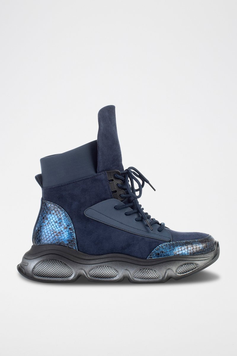 Empiècements à motifs reptile effet cuir et empiècements effet nubuck.