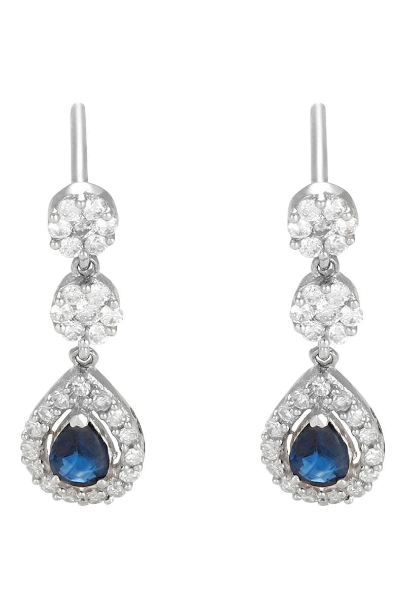 Boucles d'oreilles pendantes en or blanc serties de 29 diamants et d'un saphir.
