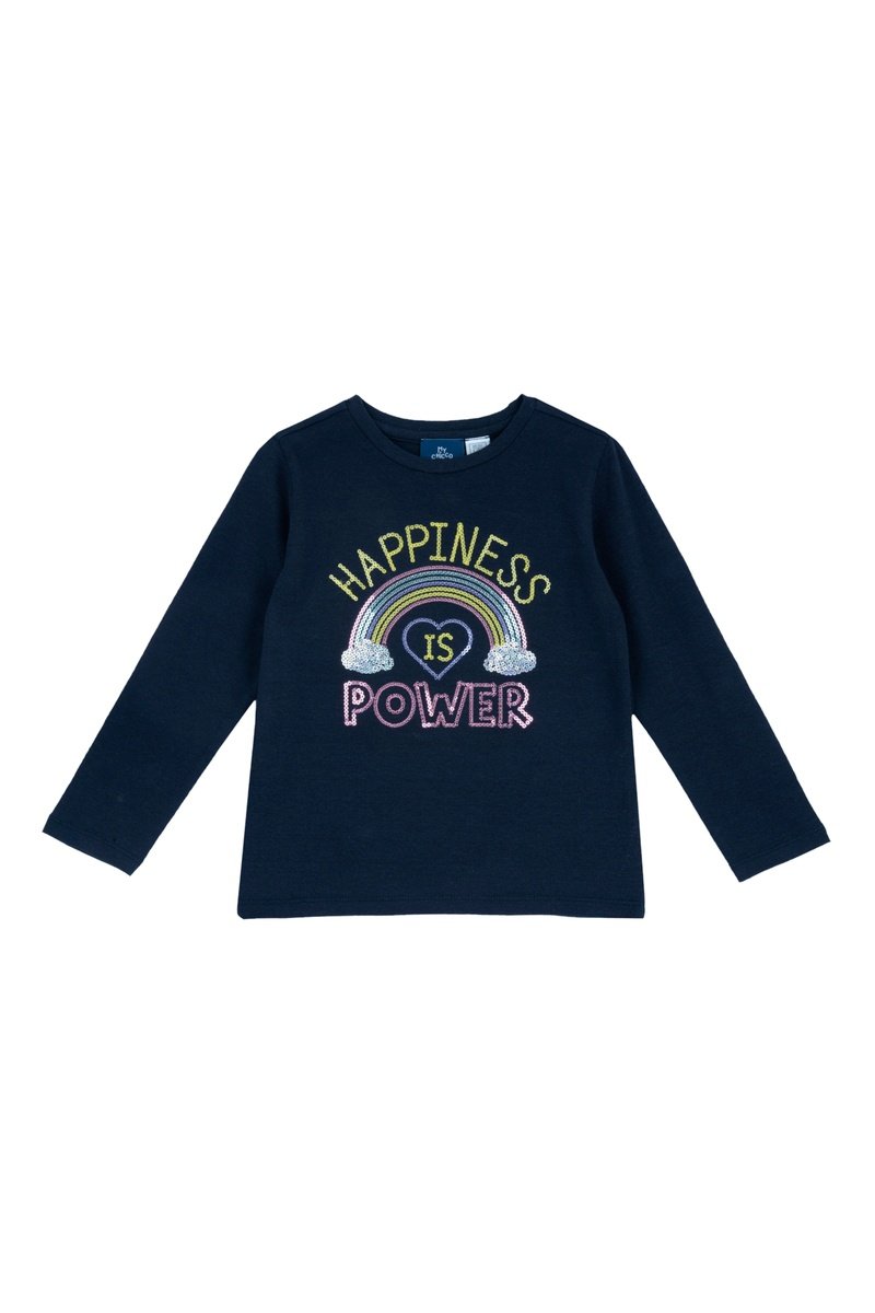 Lettrage et motifs fantaisie à sequins devant.
