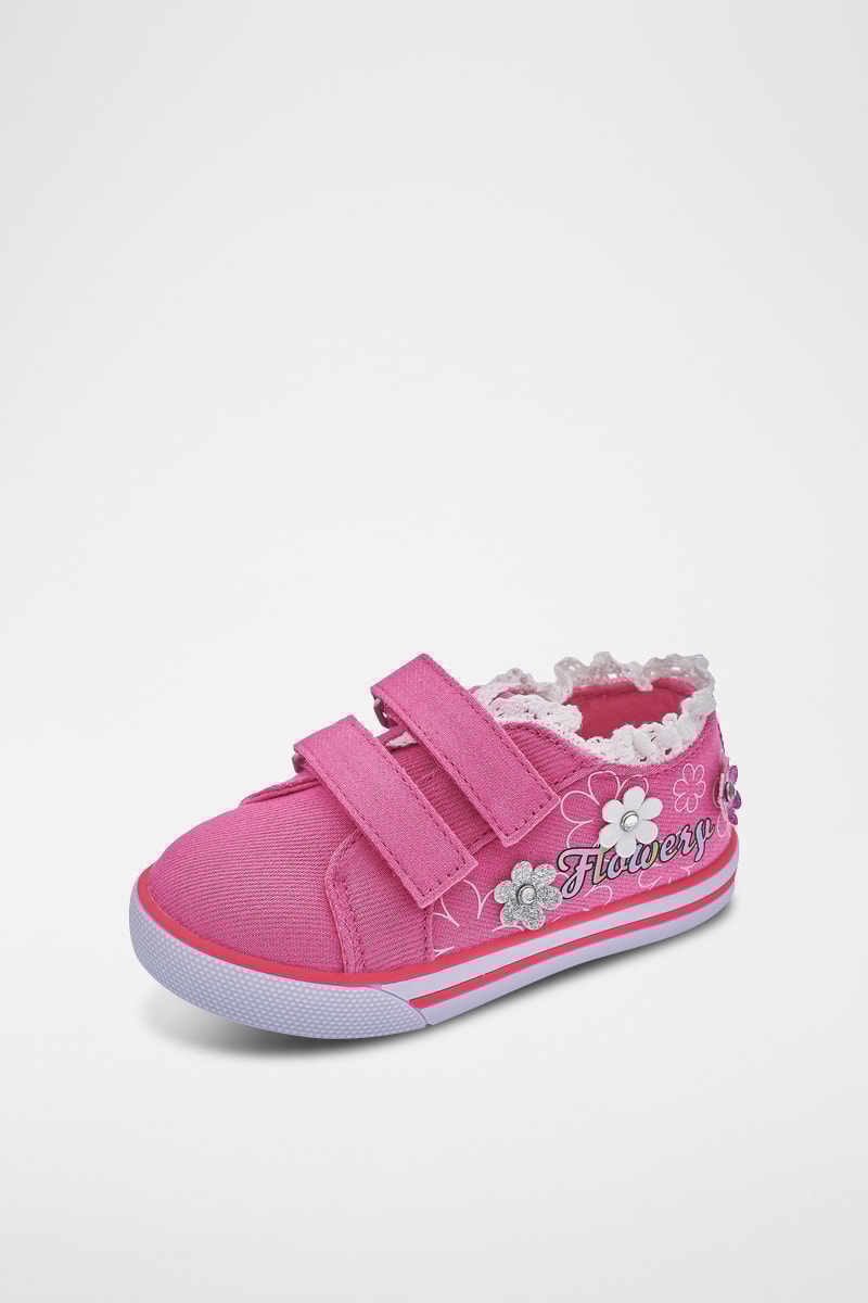 Lettrage, motifs à fleurs et empiècements forme fleur sur le côté.