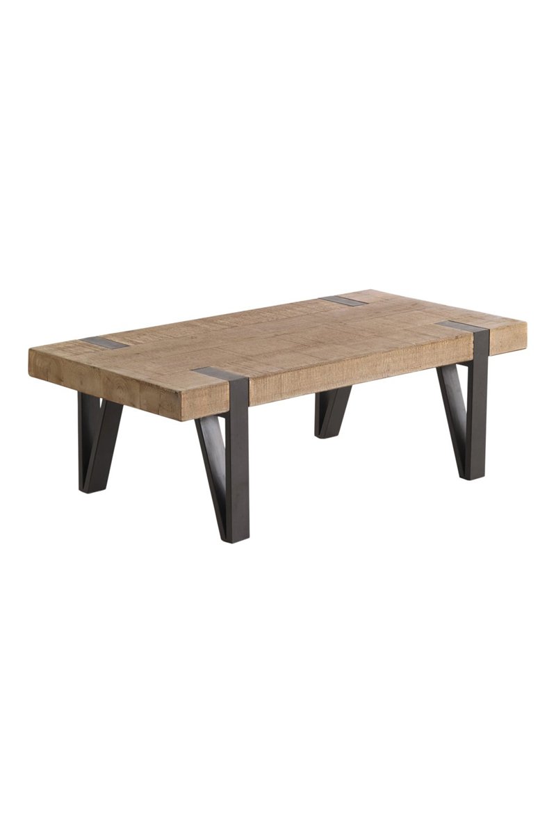 Table basse avec pieds en métal de couleur noire et plateau en sapin.
