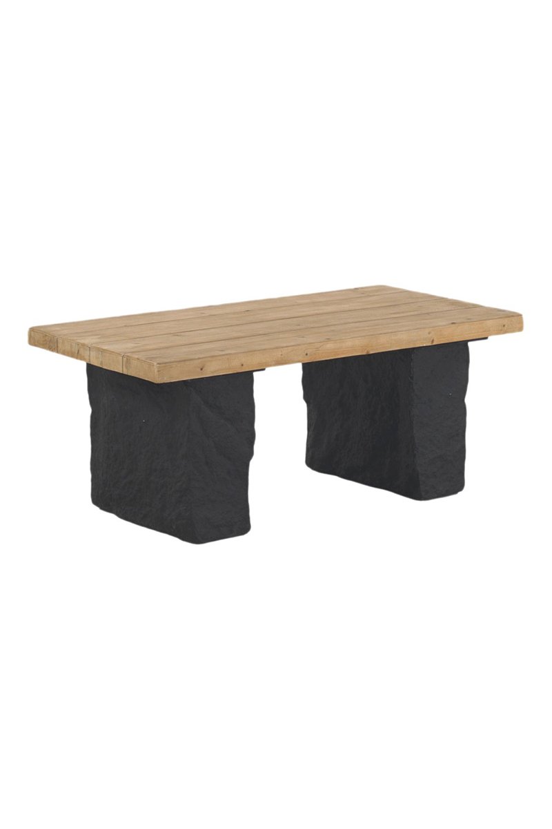 Table basse avec plateau plaqué sapin et pieds en polyrésine noire.