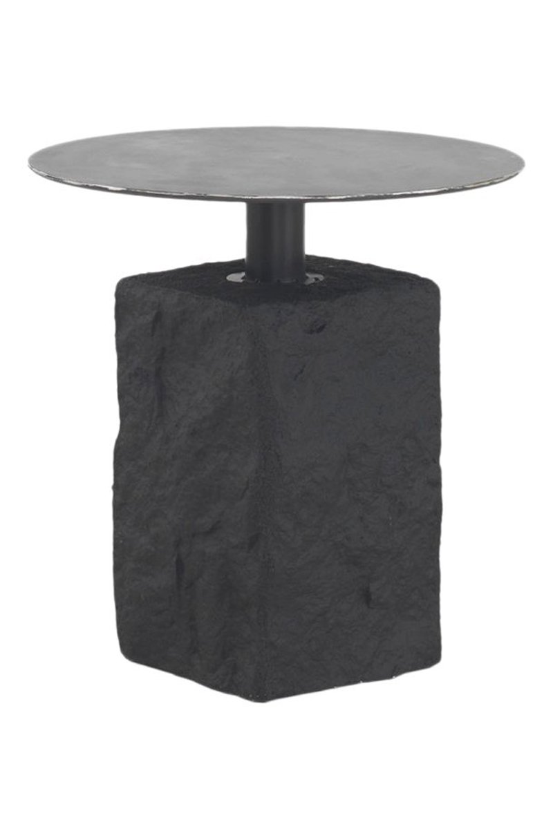 Table d'appoint avec base en polyrésine noire et plateau en MDF noir métallisé.
