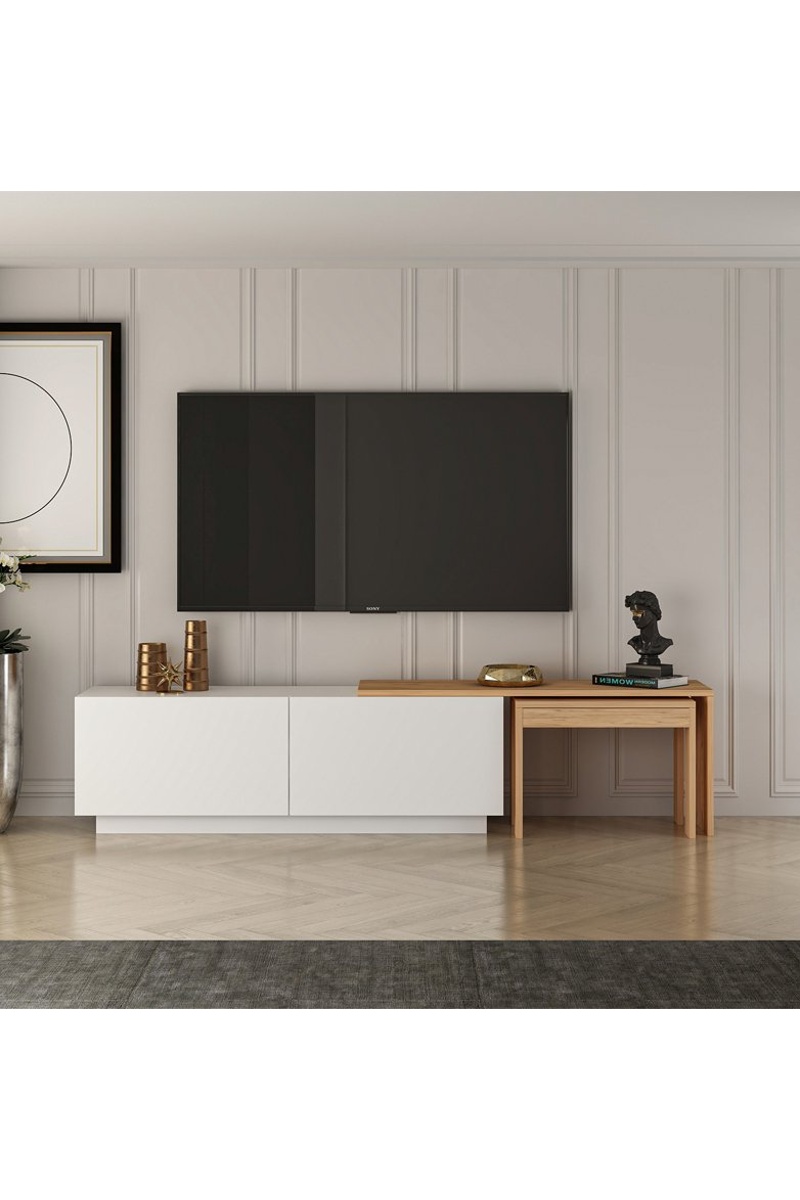 Meuble TV 2 abattants Oslo - Blanc et imitation bois