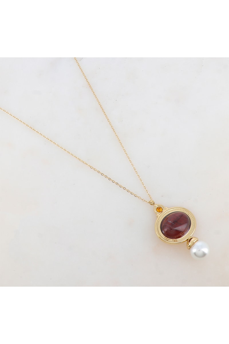 Pendentif serti d’un œil-de-taureau, de cristaux et d’une perle d’imitation.