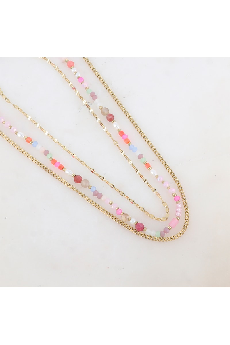 Collier multi rangs serti de perles de culture d’eau douce, de rhodonites et de cristaux.