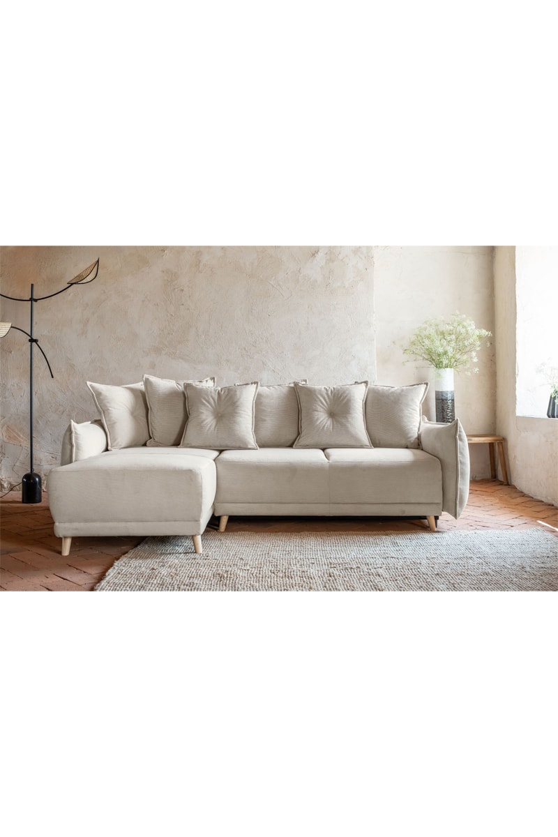 Canapé d’angle convertible Lazy Lukka - Beige - 4 places - Toucher velours - Dimensions couchage 130 x 210 cm