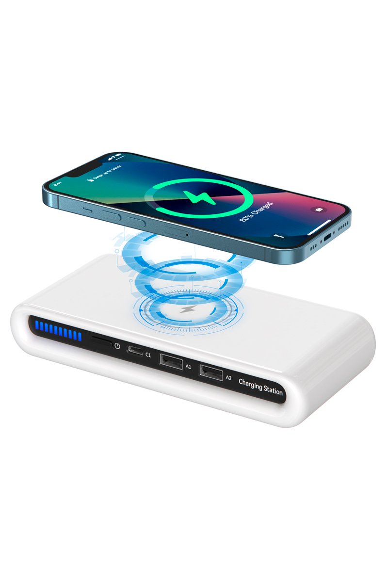 Zone supérieure avec chargeur sans fil Qi, compatible avec une charge rapide jusqu'à 15 W.
