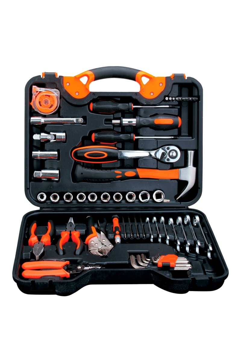 Il comprend des clés à double usage, des clés à cliquet, des pinces, un étau, des pinces à bec effilé, des tournevis à lame plate, des marteaux et des jeux de douilles hexagonales.