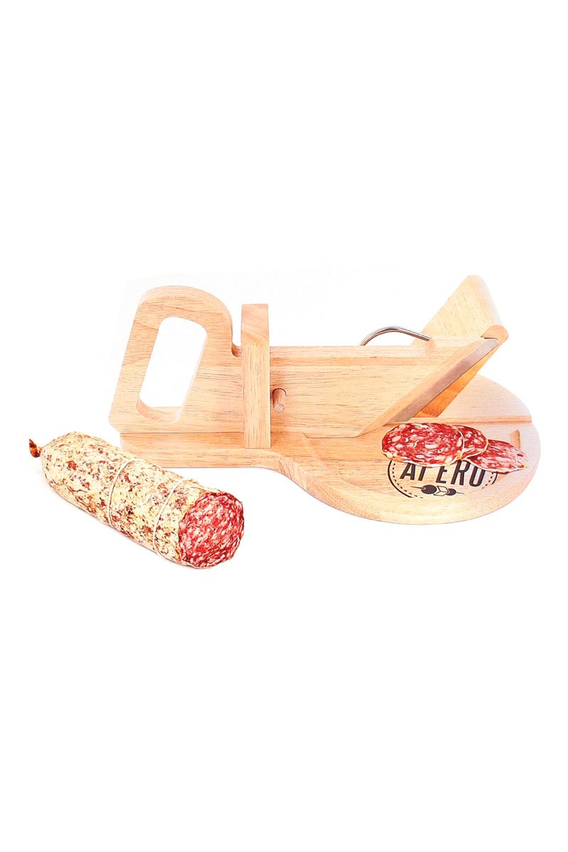 Trancheuse à charcuterie ronde en bois.