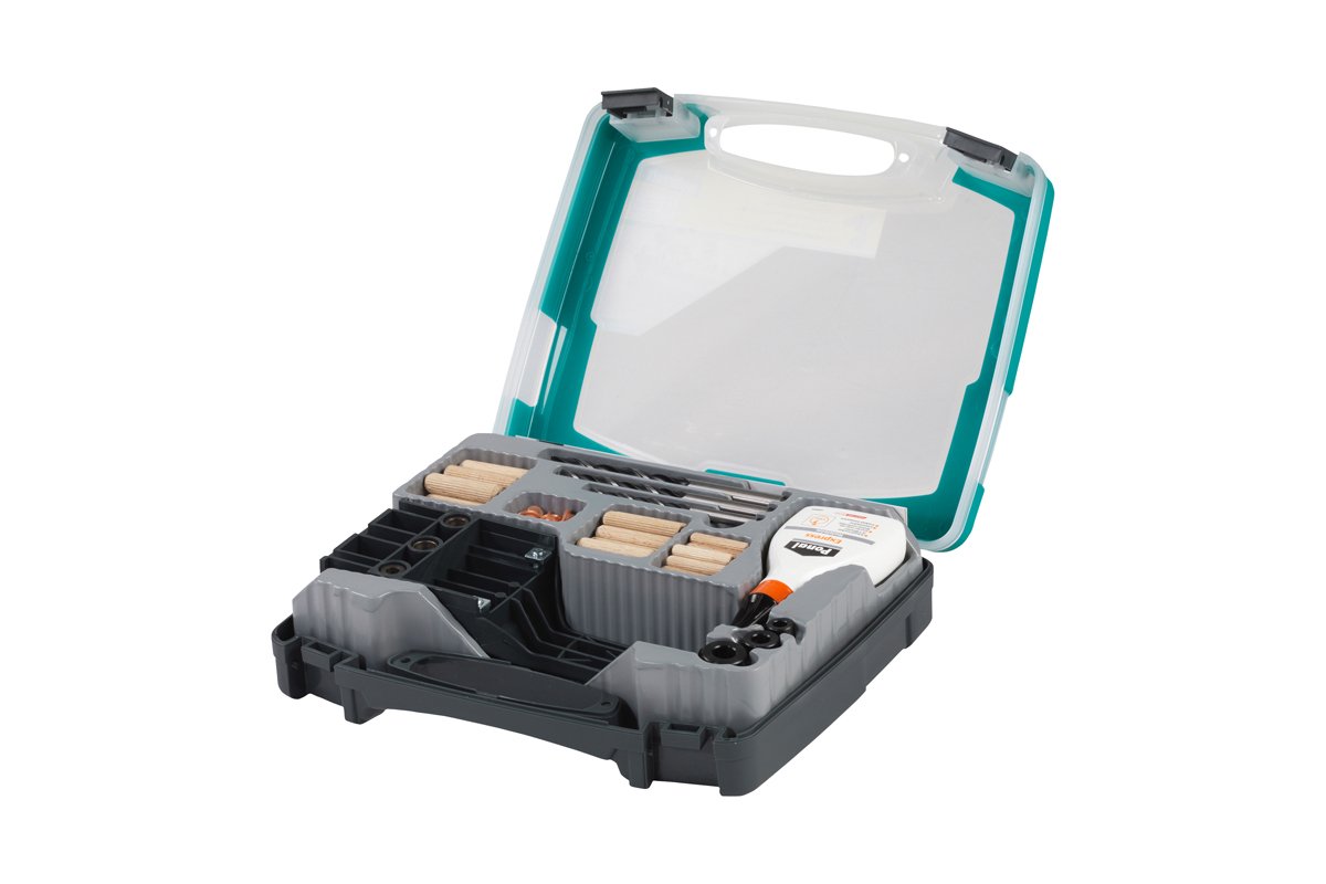 Coffret de guide d'assemblage bois pour tourillons de 6, 8 et 10 mm comprenant :