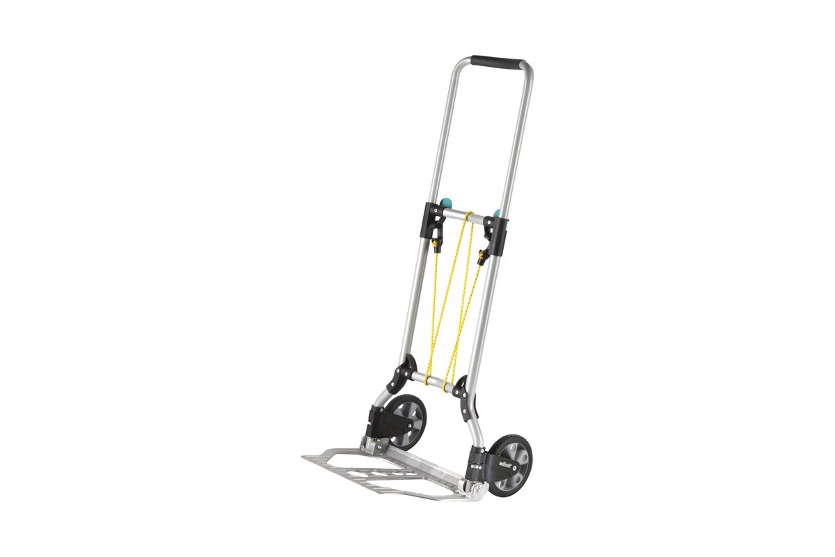 Les roues et le plateau se plient et se déplient en une seule opération. Ainsi, le TS 600 trouve sa place dans tous les véhicules et reste à portée de main lorsque vous faites vos courses.