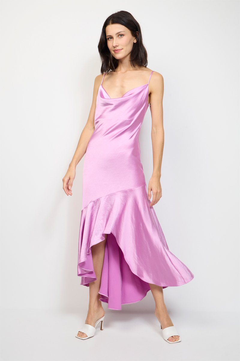 Robe longue satinée.