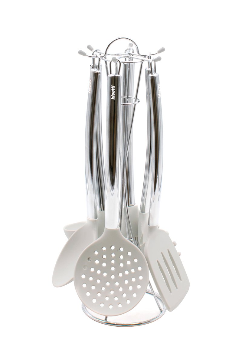 Le support en acier inoxydable au design « Carosello » est conçu pour avoir toujours à portée de main remettre le bon outil pour chaque pot différent sur le feu.
