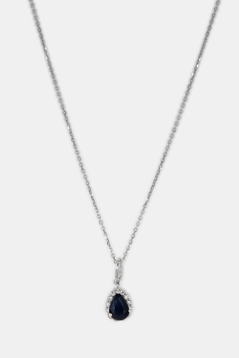 Pendentif en or blanc serti de 20 diamants et d’un saphir.
