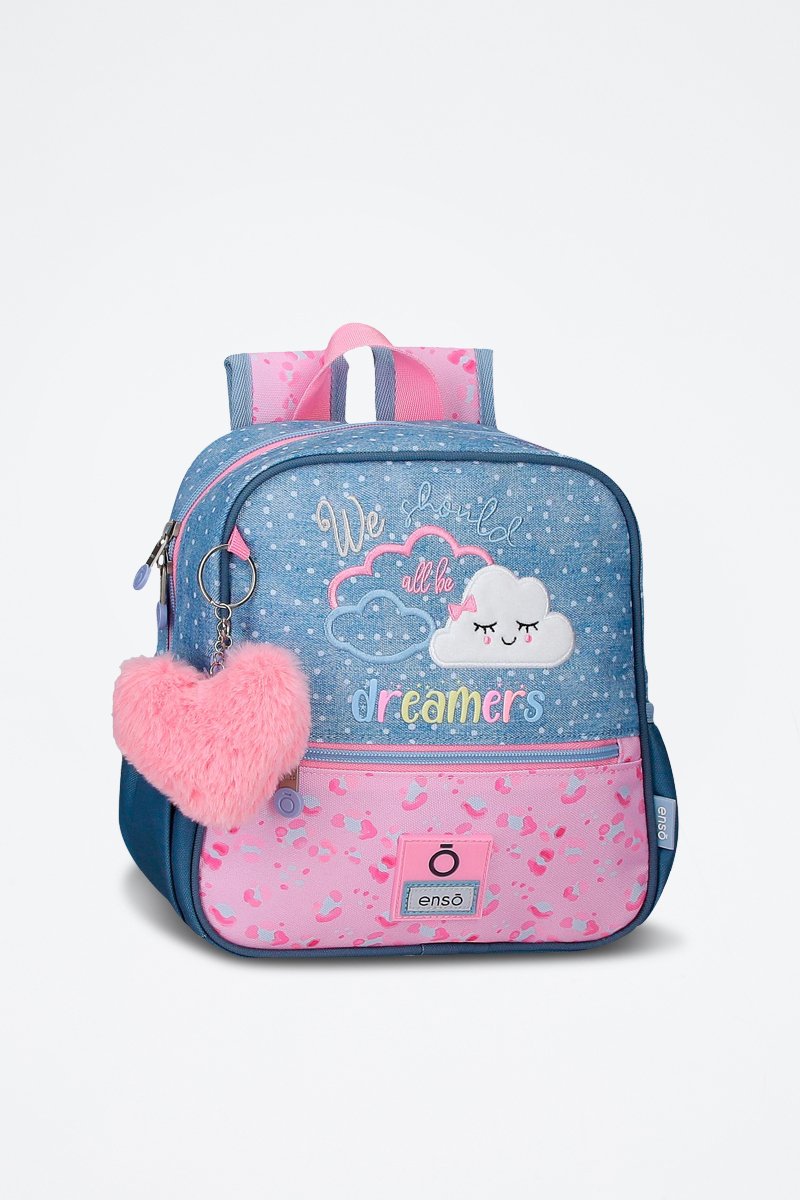 Poche zippée, lettrage, motifs fantaisie brodés et porte-clés avec pompon en fourrure synthétique devant.