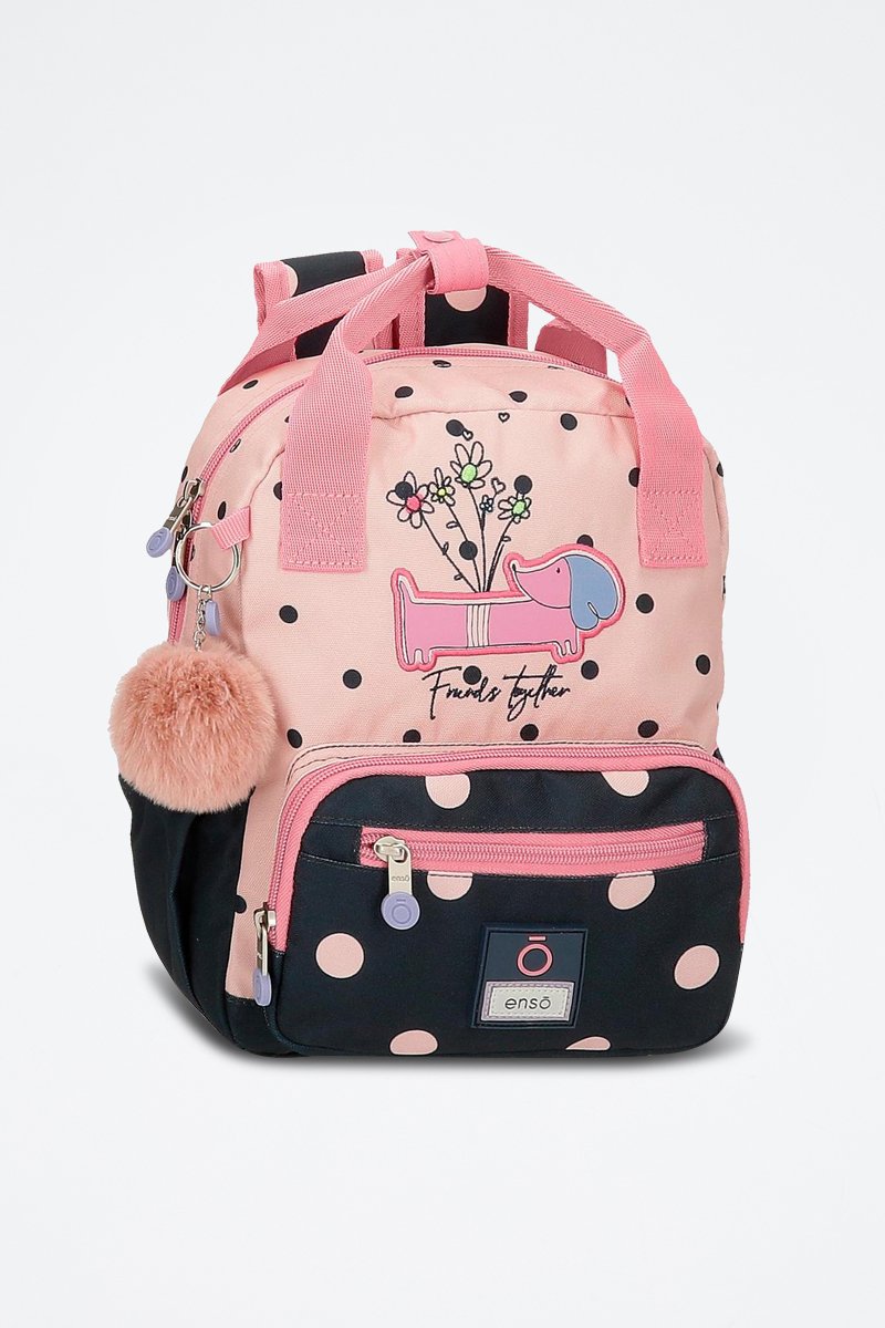 2 poches zippées, lettrage brodé, motifs fantaisie, porte-clés avec pompon en fourrure synthétique et empiècement avec logo devant.