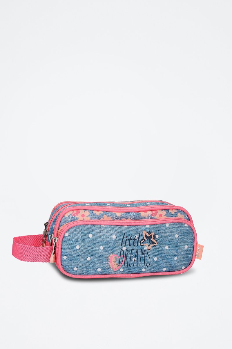 Poche zippée, lettrage, motifs à pois et fleurs au dos.